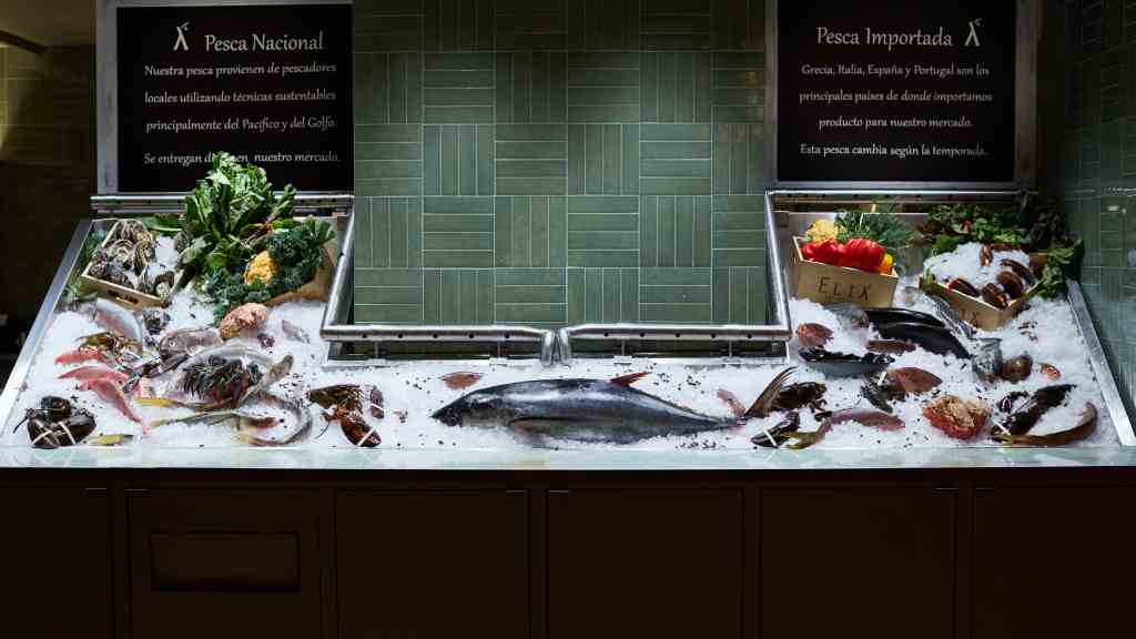 Una visita a Eliá comienza por la vista. El “Mercado Eliá” es la exhibición del producto fresco (de mar principalmente) que se tiene en el día y que representa la materia prima de gran parte de la carta. Se puede ver desde casi todo el restaurante, pero se invita al comensal a acercarse a seleccionar, acompañado y asesorado por la especialista de experiencias del Restaurante.
